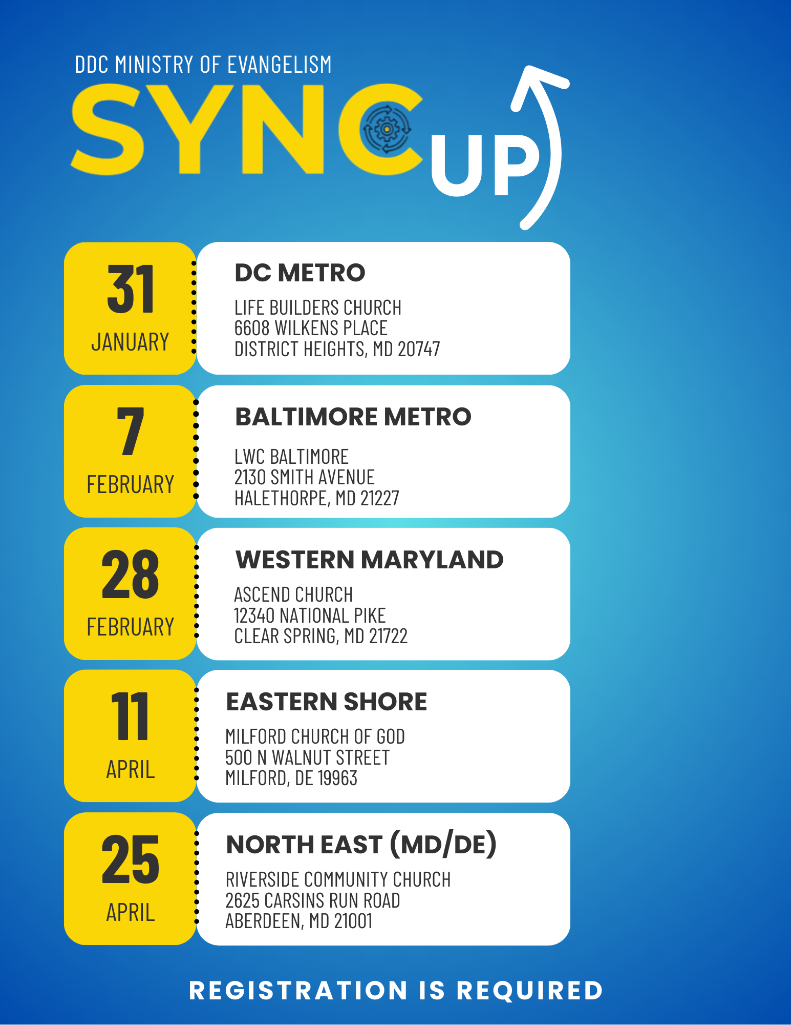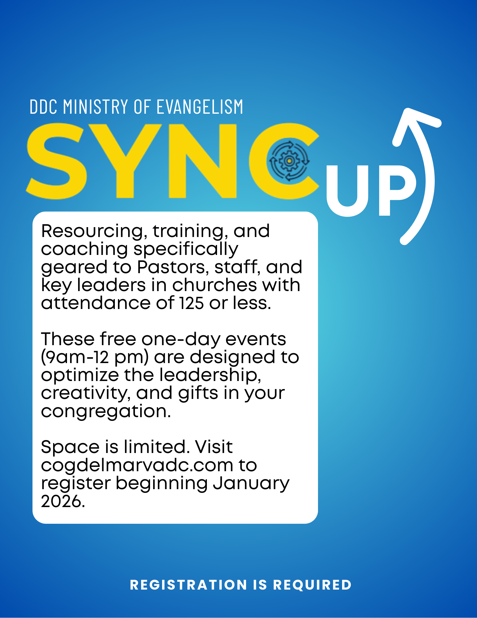 For more information reach out to the regional office evangelism@cogdelmarva-dc.org or (410) 531-5351