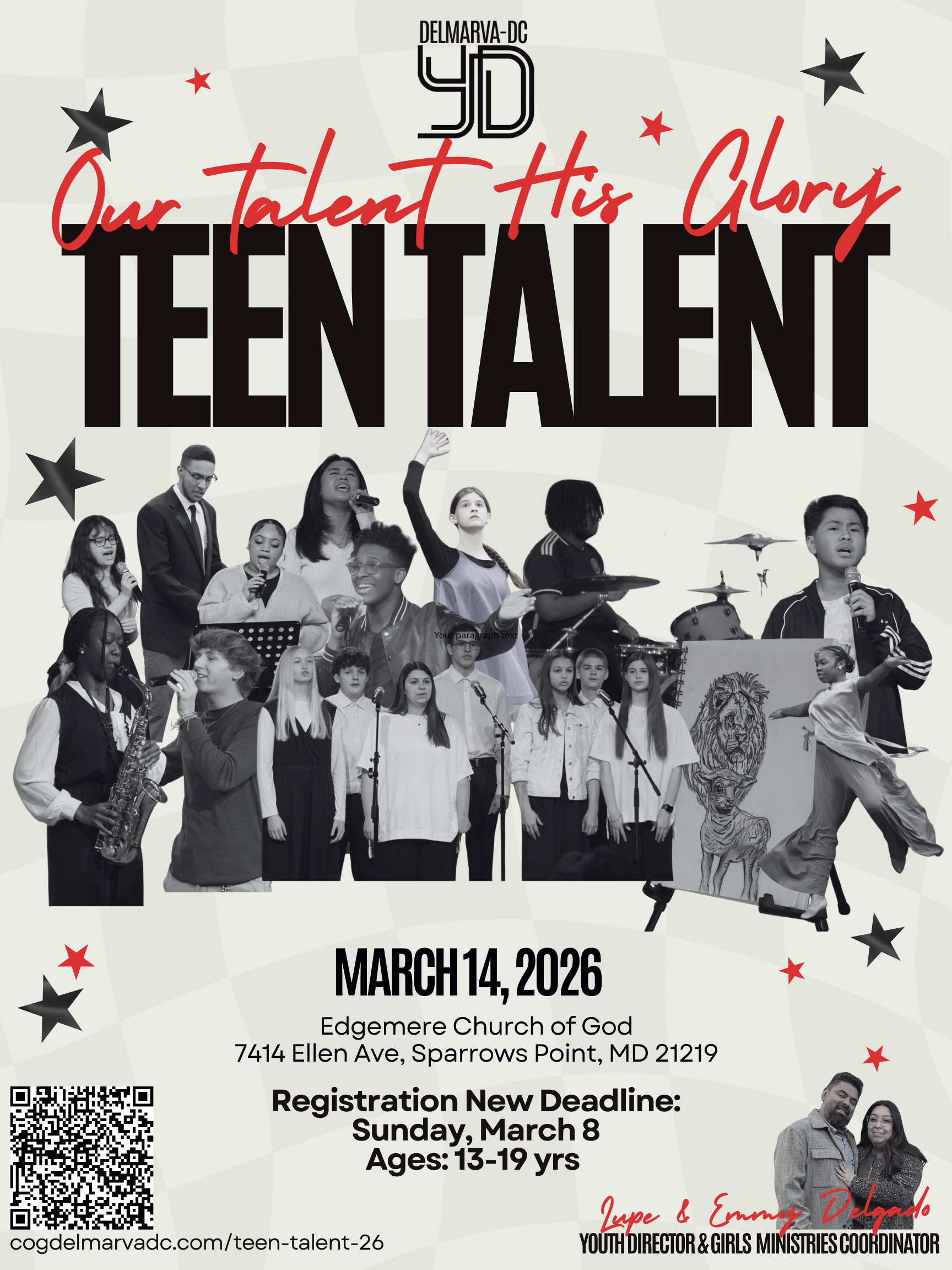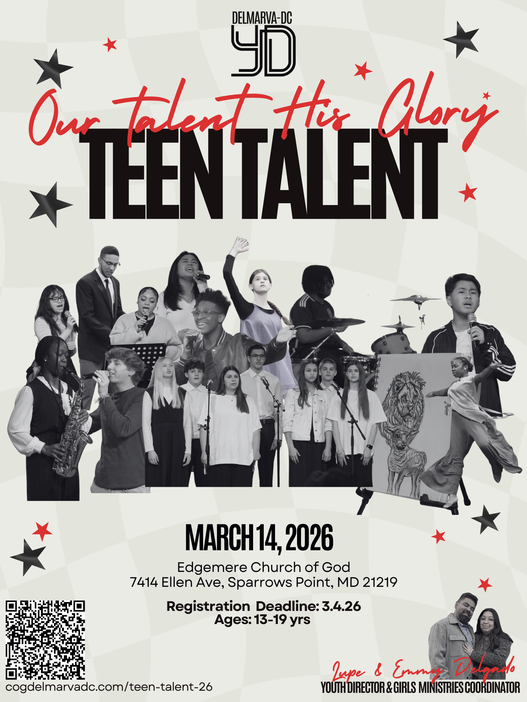 Teen Talent will be hosted by Edgemere Church of God on March 14th! Registration Deadline is on March 4th. If you have any questions please reach out to the Youth Department (410) 531-5351 ext. 5 or youth@cogdelmarva-dc.org.